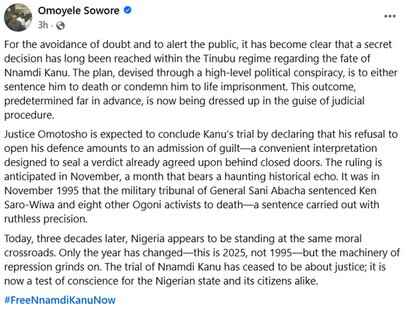 Sowore, the founder and presidential candidate of the African Action Congress (AAC) in the 2019 and 2023 presidential elections, stated this on Wednesday, November 5, 2025, on his Facebook page.